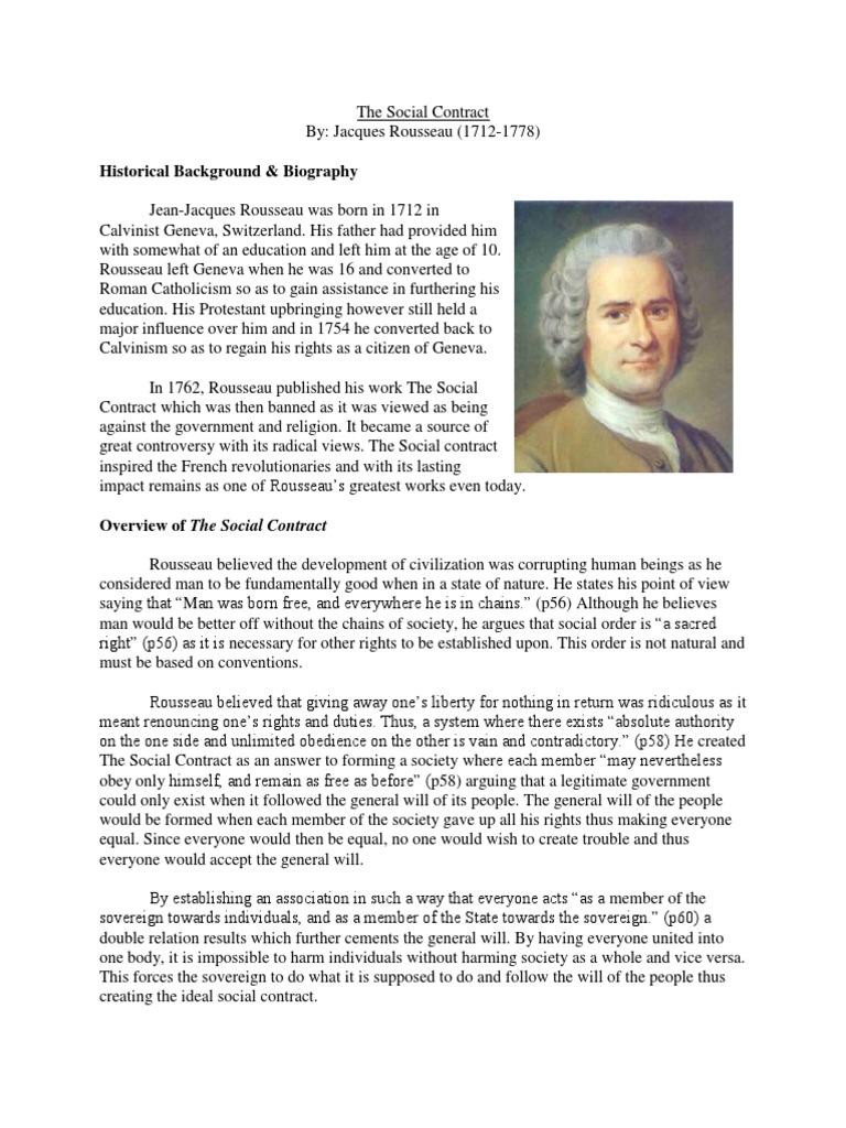Page 1 of 9 sc-notesdoc Rousseau On the Social Contract Introductory Notes The social contract is Rousseaus argument for how it is possible for a state to ground its authority on a moral and rational foundation. English philosophers Thomas Hobbes and John Locke and the French. THE SOCIAL CONTRACT JEAN-JACQUES ROUSSEAU 1712-78 was born a Citizen of Geneva an inhabitant with full political rights to Isaac Rousseau a skilled craftsman.